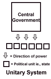 | Definition: One central government controls weaker states. Power is not shared between states, counties, or provinces. | Definition: A weak or loose organization of states agrees to follow a powerful central government. nations can choose to follow or not follow the lead of the weak central government. | Power is shared by a powerful central government and states or provinces that are given considerable self-rule, usually through their own legislatures. |